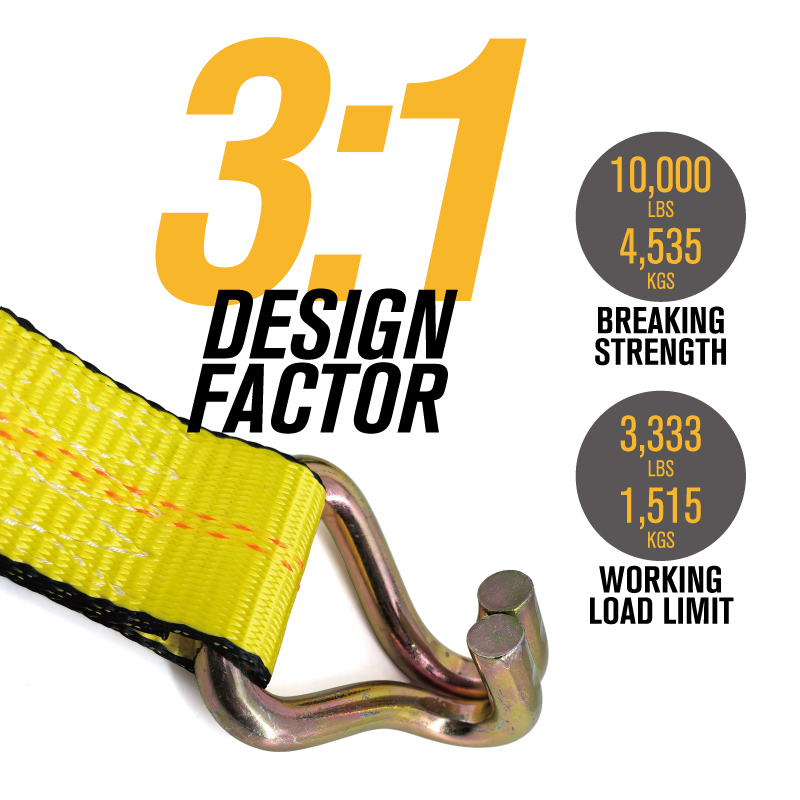 Combining versatility with extreme durability, this 2" x 30' Premium Ratchet Strap features black edges to prevent fraying at critical contact points. Designed with a 3:1 safety design factor in accordance with WSTDA guidelines, it offers a dependable 3,333 lbs working load limit (WLL). The 30ft length and reinforced Double J Hooks make it the professional's choice for securing heavy equipment to D-rings and rails with absolute confidence.