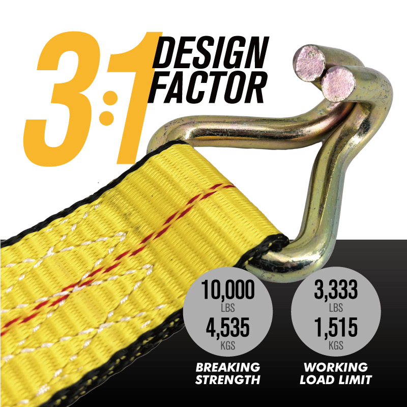 Combining versatility with extreme durability, this 2" x 40' Premium Ratchet Strap features black edges to prevent fraying at critical contact points. Designed with a 3:1 safety design factor in accordance with WSTDA guidelines, it offers a dependable 3,333 lbs working load limit (WLL). The 40ft length and reinforced Double J Hooks make it the professional's choice for securing heavy equipment to D-rings and rails with absolute confidence.